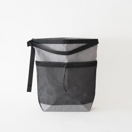 袋口の部分をクルクルと巻くことができるトートバッグ。 荷物の量に応じて巻き方を変えて使うことができ、バックルを外すと開口部が大きく開きます。 内側には手持ち用のハンドルがつき、袋口のテープは伸ばせば斜めがけで使うことができます。 バッグ本体には軽くて丈夫でシワ感のあるナイロン素材を使用。 外側のメッシュの大きいポケットがポイントです。