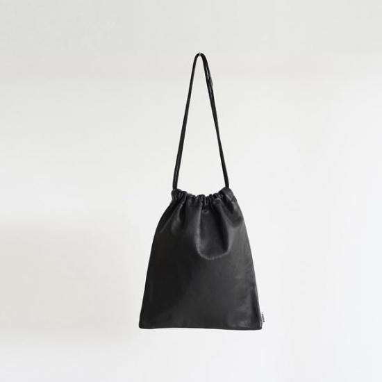 軽く丈夫で型崩れしにくいゴートレザー、起毛が均一でキメの細かい上品なスエードで作った巾着。 紐の通し方が輪になっているため、肩から掛ける時も快適に使えます。 携帯、財布、鍵に加えて、ポーチや手帳なども入るサイズです。 ゴート素材の巾着は黒い紐を使っています。